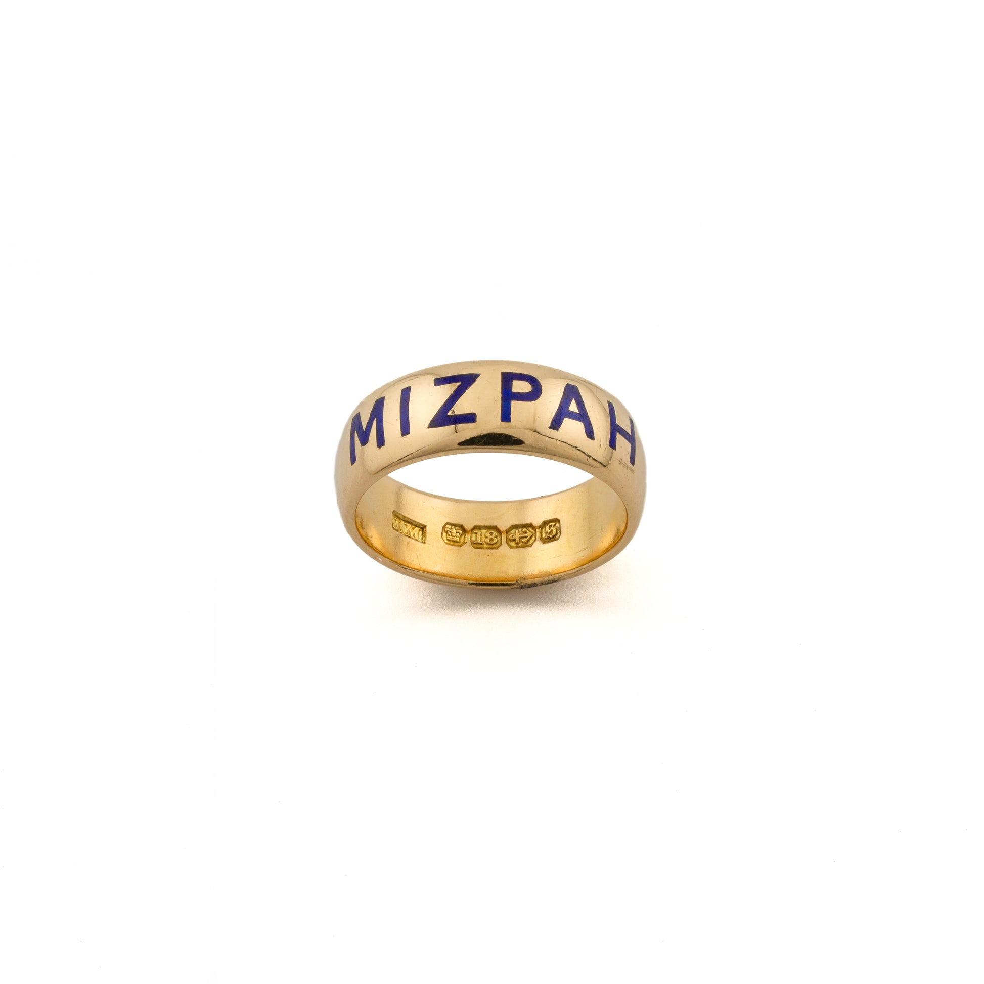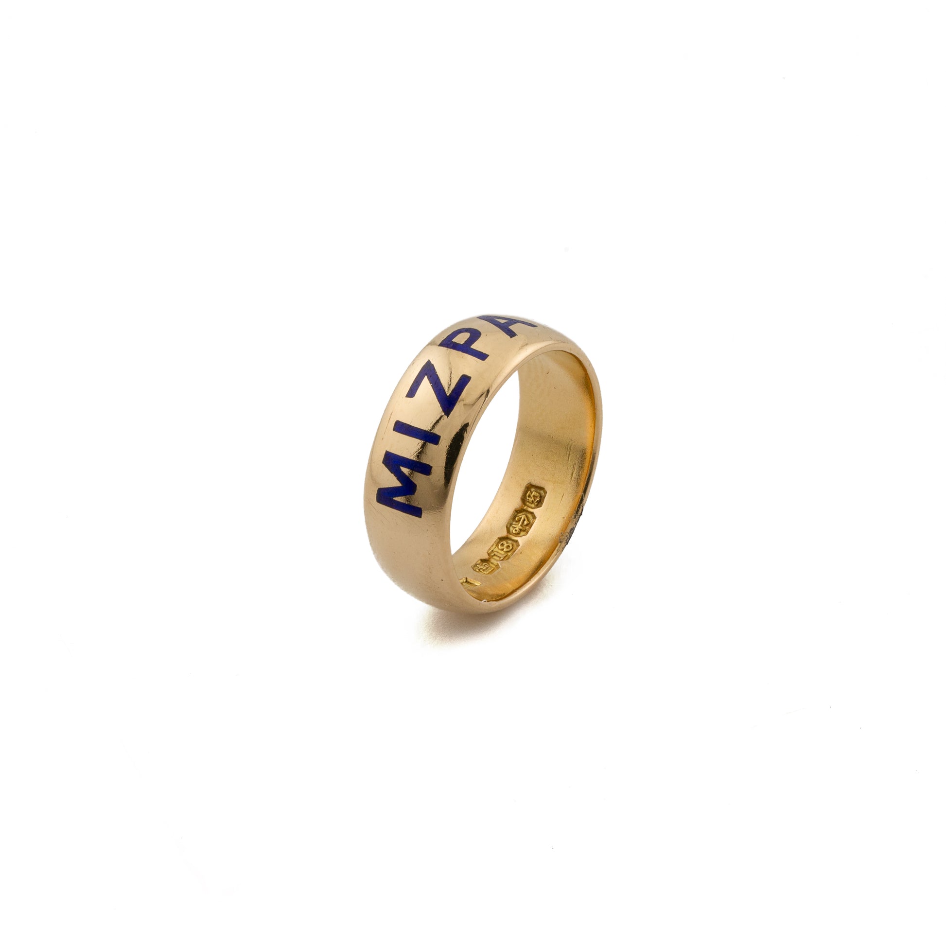 This 18ct yellow gold band features striking blue enamel detailing spelling out "Mizpah." Fully hallmarked and presenting a wide structure, it offers a distinctive and substantial presence on the finger. Its rich yellow hue and enamel contrast make it a remarkable example of classic style.