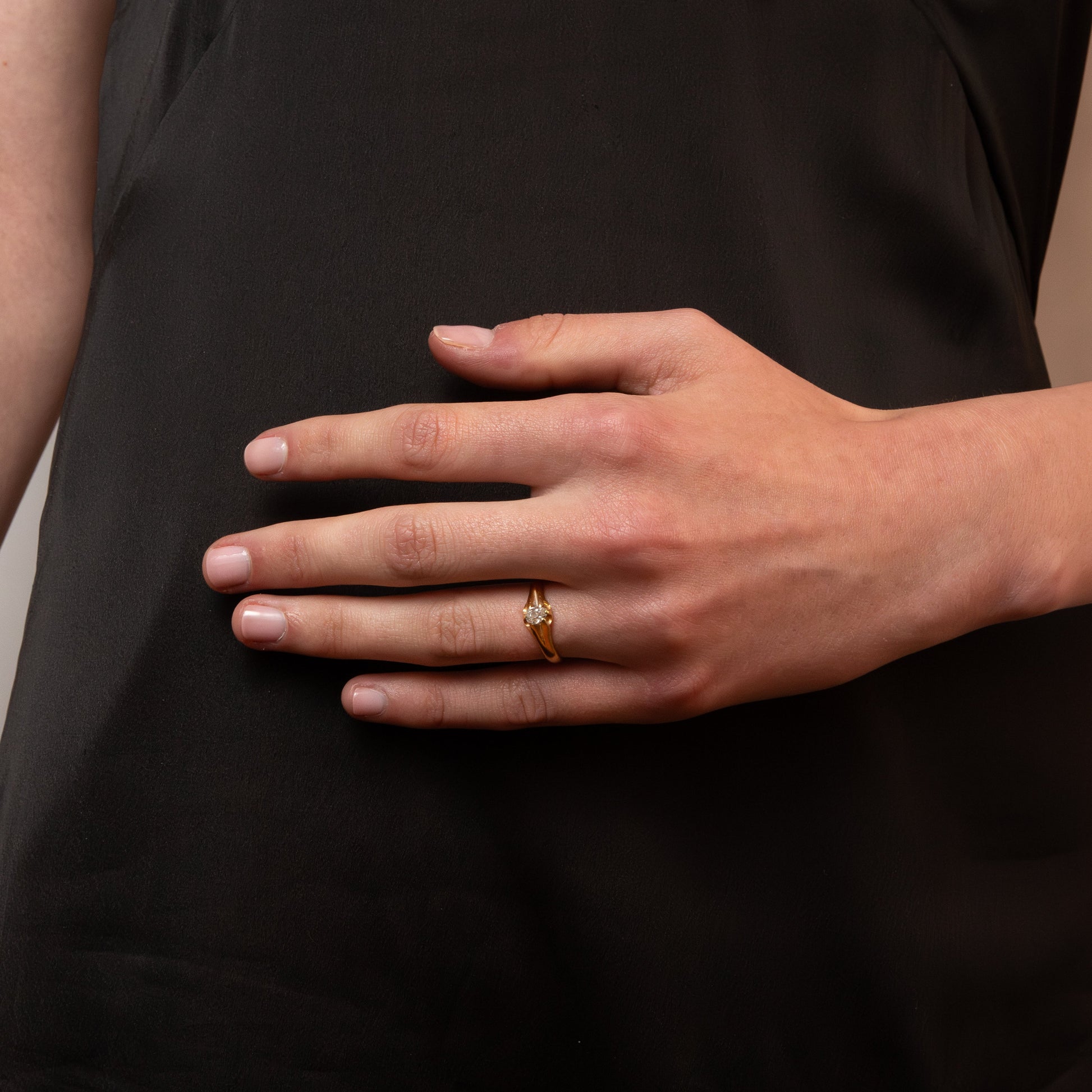 This late Victorian 18ct gold ring showcases a .28ct Old Mine cut solitaire diamond. Its classic design highlights the diamond’s unique shape, making it a distinguished piece for any collection.