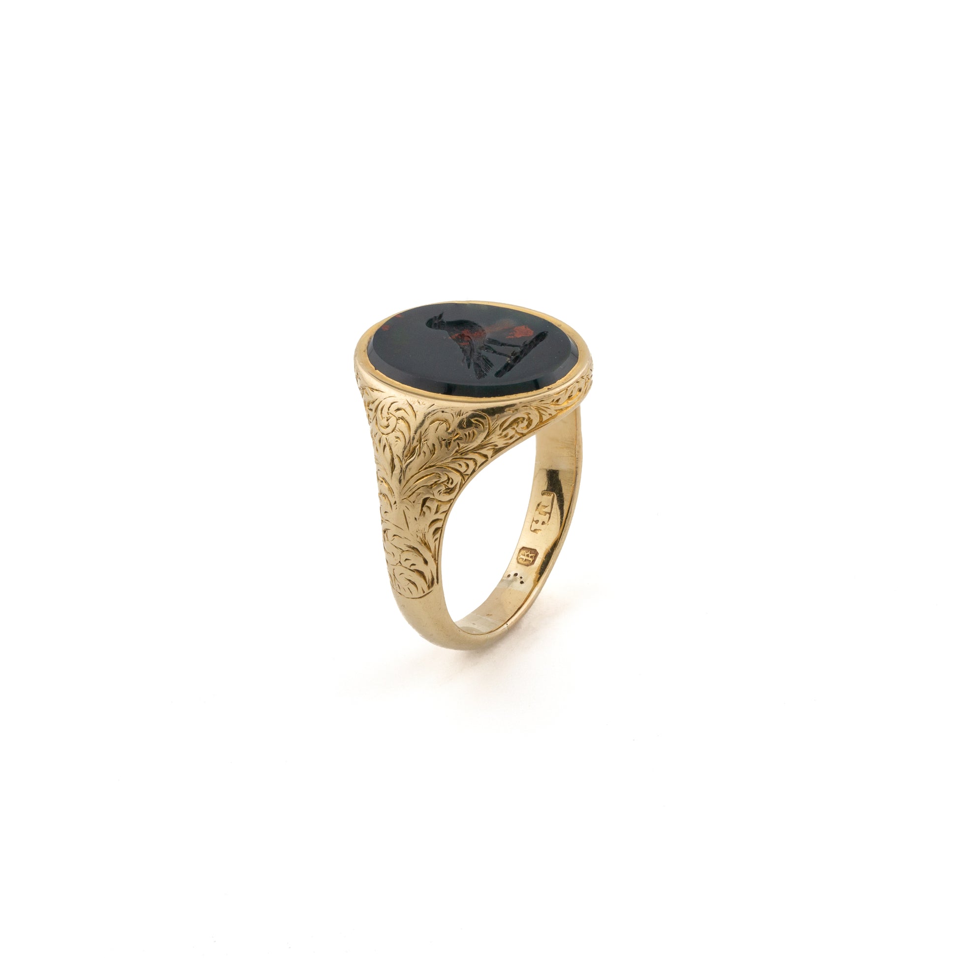 fine Victorian bloodstone signet ring, beautifully engraved with a bird crest in intaglio. Crafted in solid 18ct yellow gold, the ring features elegant floral scroll engraving across the shoulders and shank, showcasing exquisite hand-chasing typical of English goldsmiths of the late 19th century.