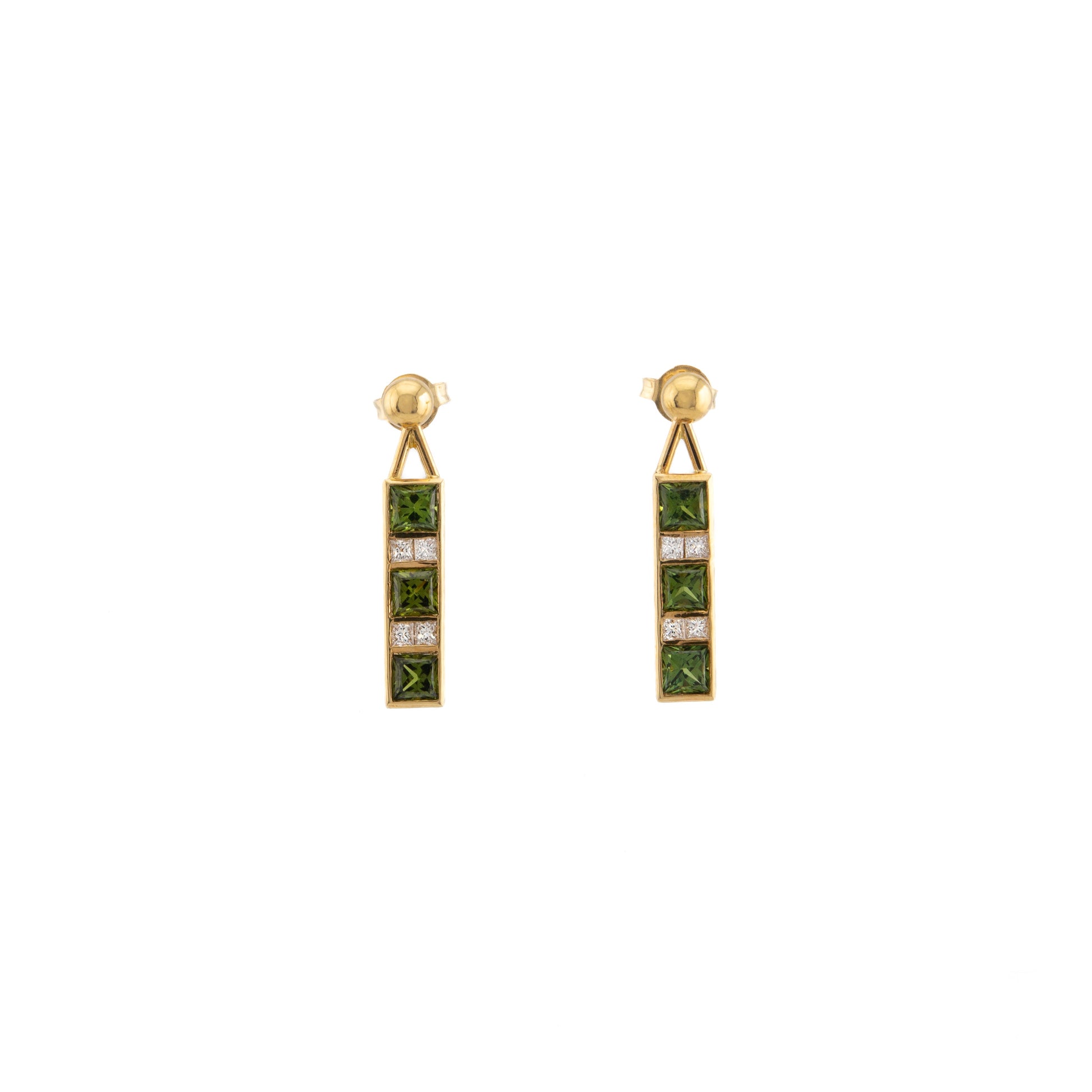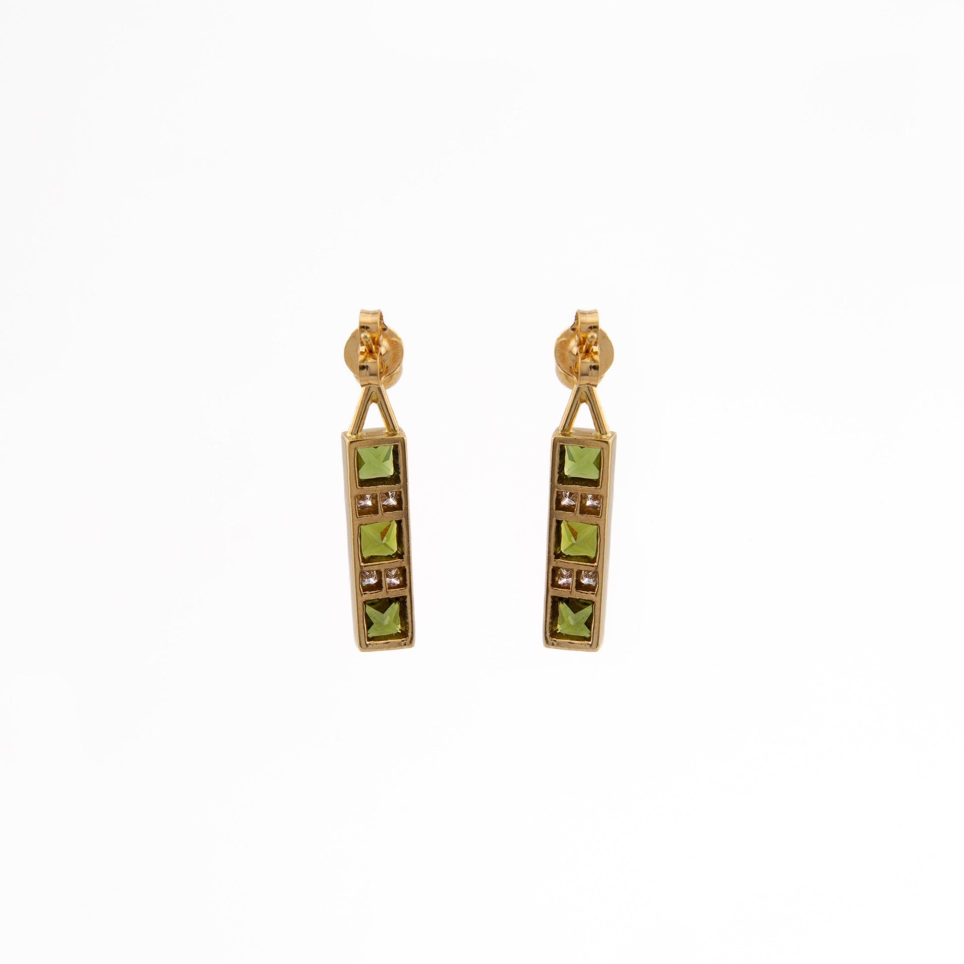 Elegant rectangular drop earrings featuring vibrant peridots complemented by sparkling diamonds, all set in luxurious 18ct gold. The verdant gemstones create a refreshing contrast against the brilliant diamonds, offering a sophisticated statement piece for any occasion.