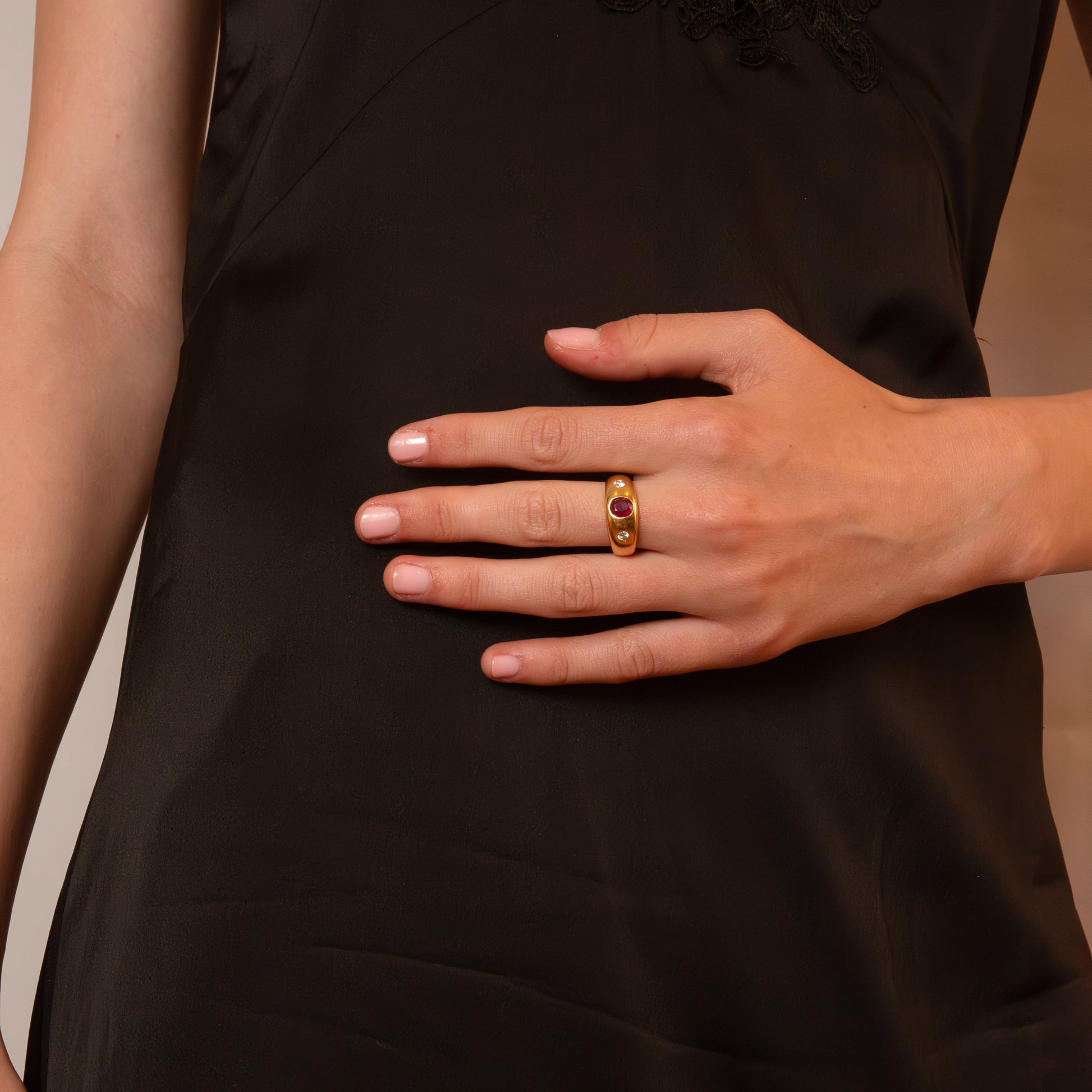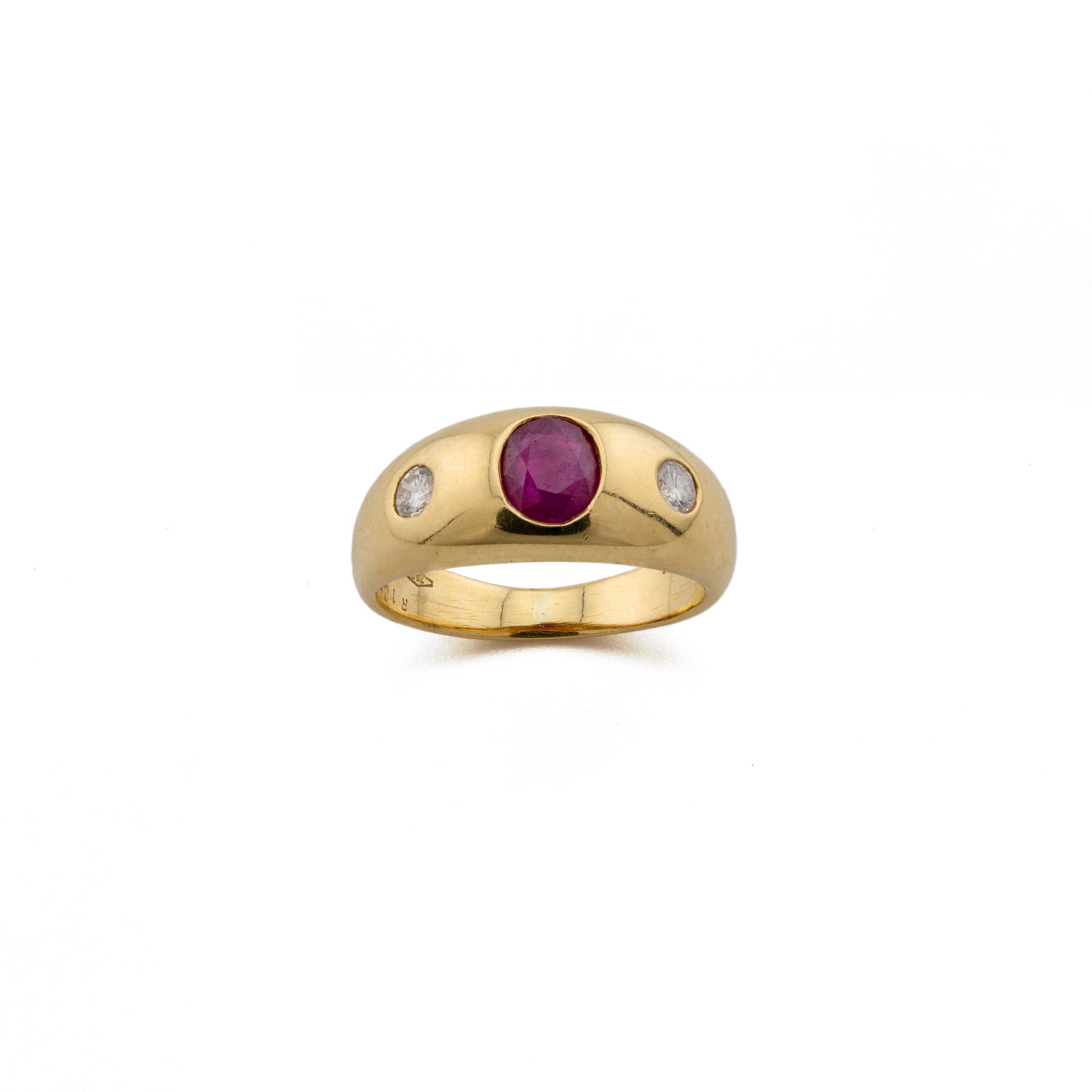 The ring features a vivid round-cut natural ruby weighing approximately 1.07 carats, heat-treated and of Thai origin, set flush within a smooth domed band. Flanking the ruby are two bright brilliant-cut diamonds totalling approximately 0.24 carats, graded J colour, SI clarity. The gemstones are securely gypsy-set, their fire and brilliance enhanced by the polished gold surface.