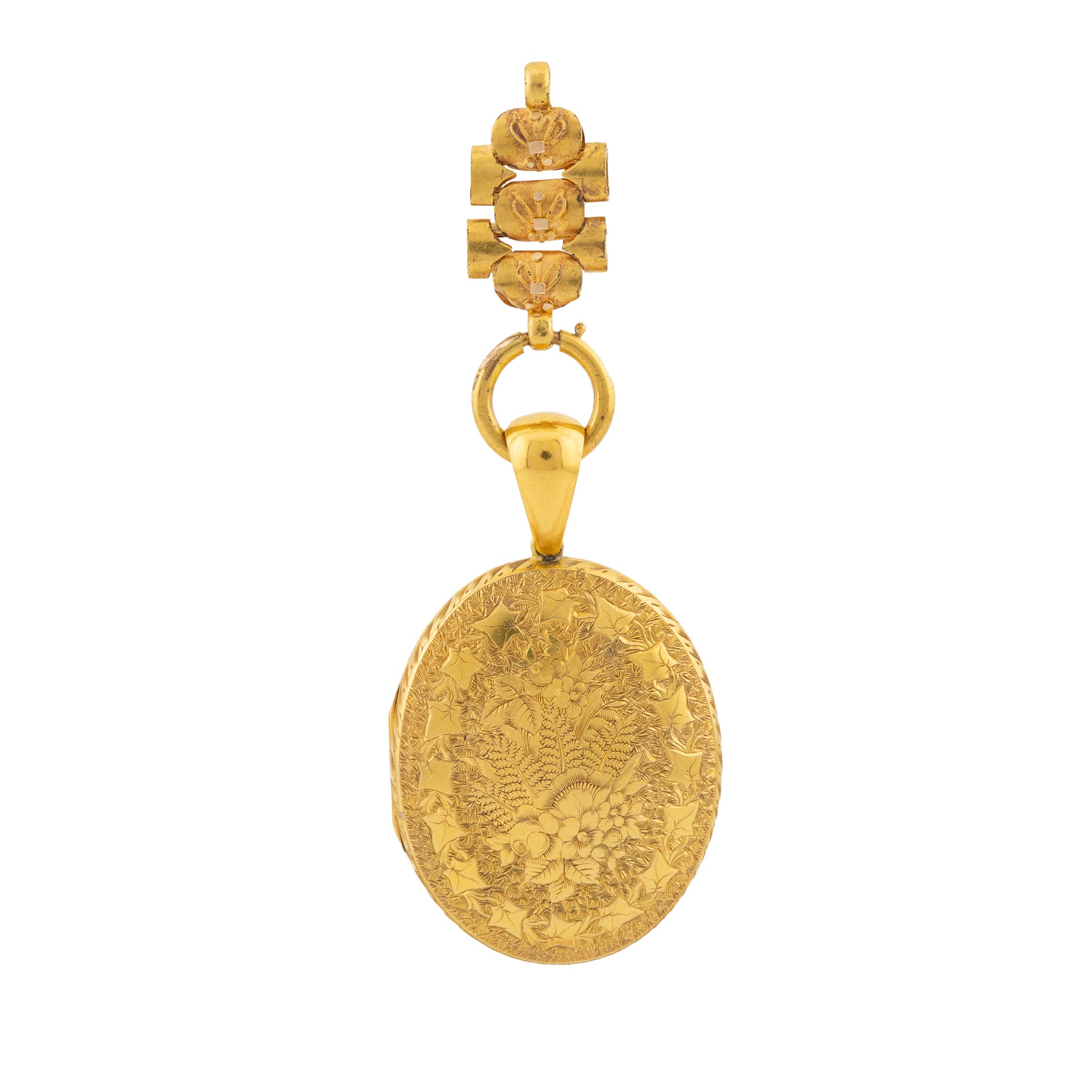 The large oval locket is exquisitely hand-engraved with intricate foliate patterns, framed by a delicate border. Its generous size and hinged opening make it perfect for holding portraits or keepsakes. The locket suspends from an ornate triple-link drop, completing the statement look.