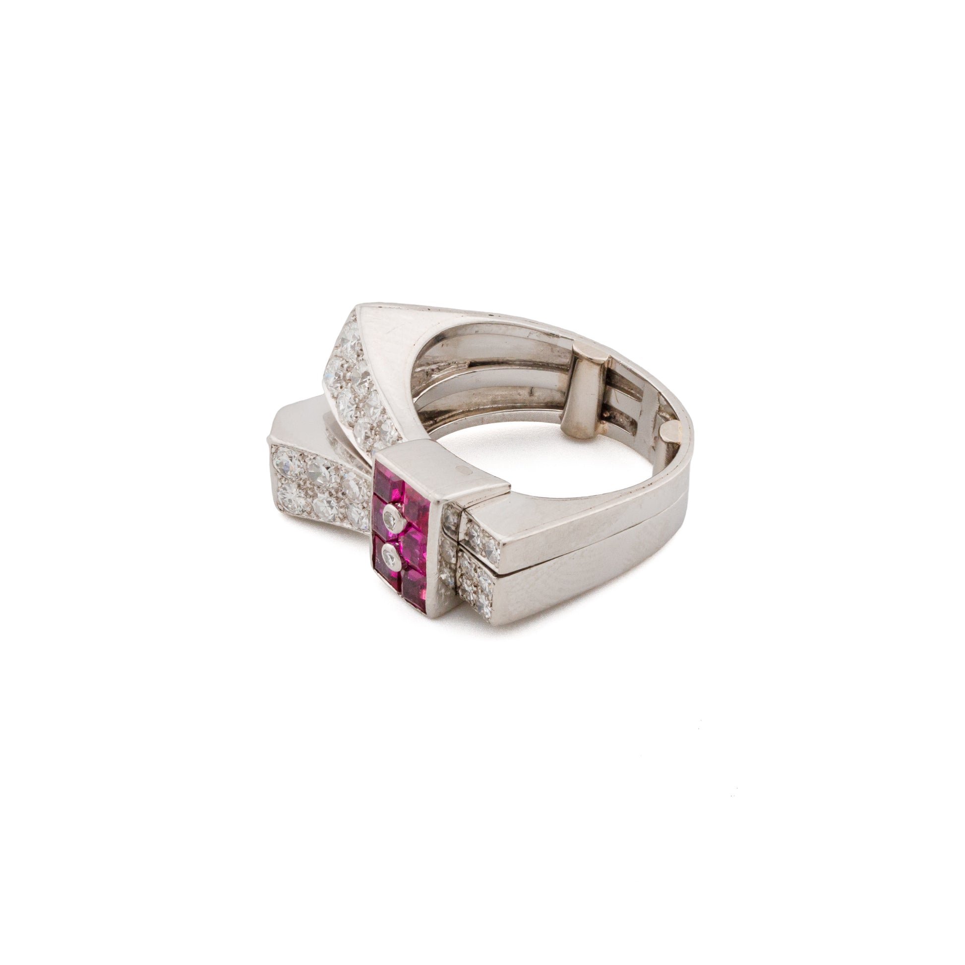 The warm red of the rubies contrasts beautifully with the crisp sparkle of the diamonds and the cool, enduring sheen of platinum, creating a perfectly balanced and elegant statement piece. Substantial yet refined, this ring captures the sophistication and confidence of mid-century jewellery design.