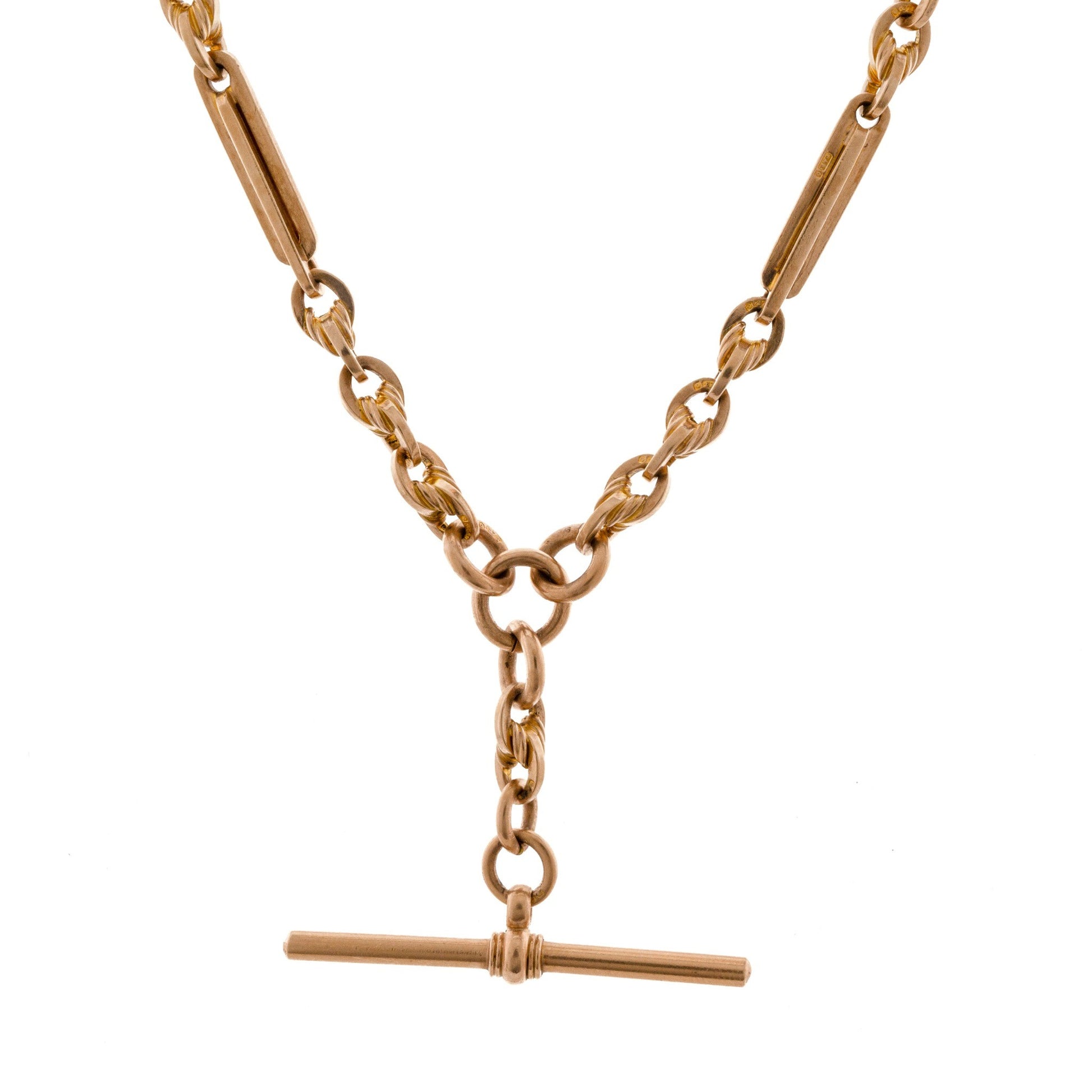 This fine example of a traditional Albert chain is crafted in solid 9ct yellow gold, featuring alternating trombone and fetter links that give it both strength and elegance. The chain is fitted with a classic T-bar drop and two swivel clips, making it versatile for attaching fobs, lockets, or pocket watches.