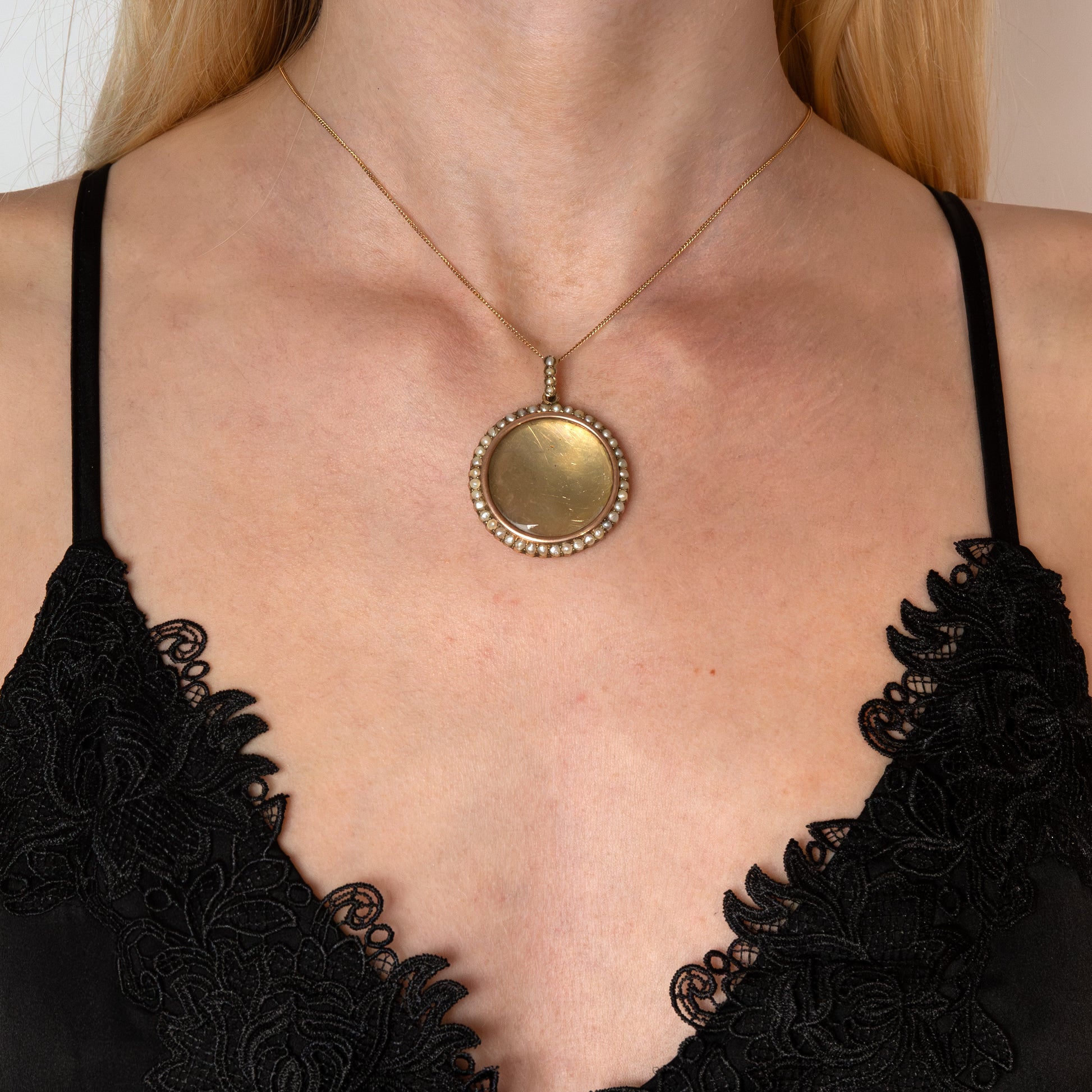 A beautiful late-Victorian locket, dating to around c.1890 and crafted in warm 9ct rose gold. The circular form is framed by a classic pearl-set border, giving the piece a refined, softly luminous finish and strong period character.