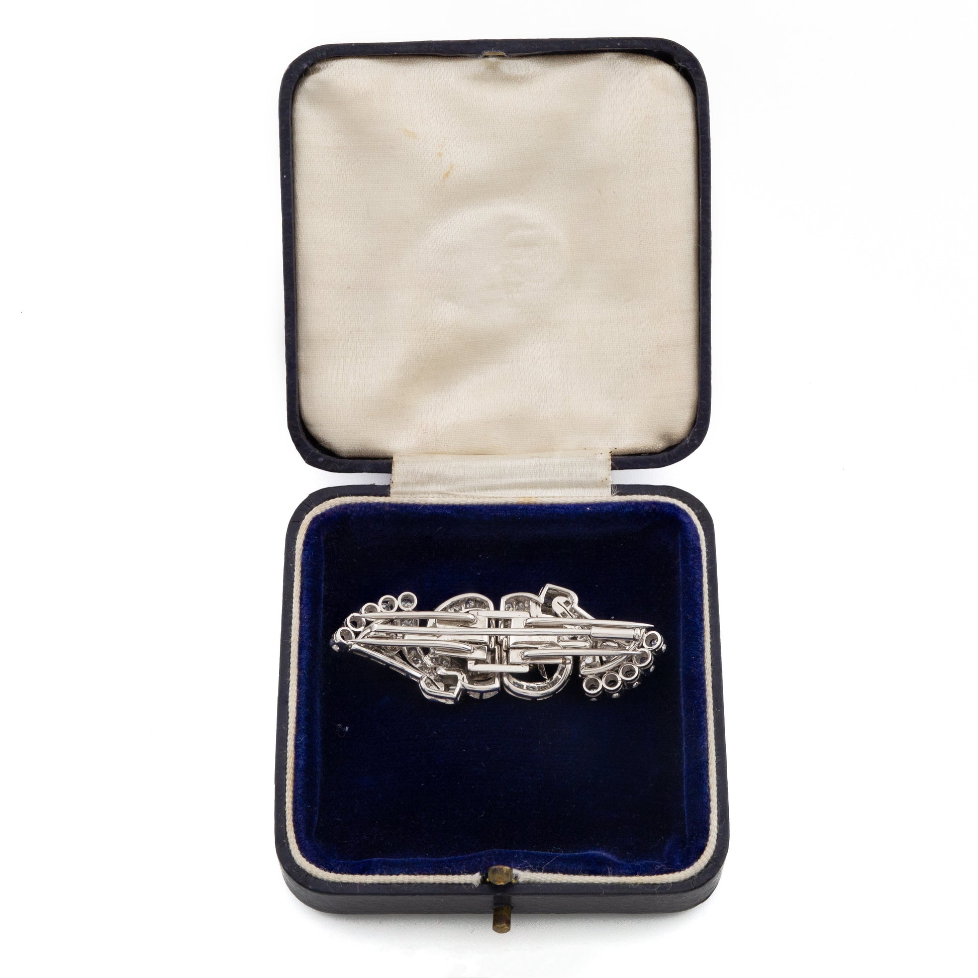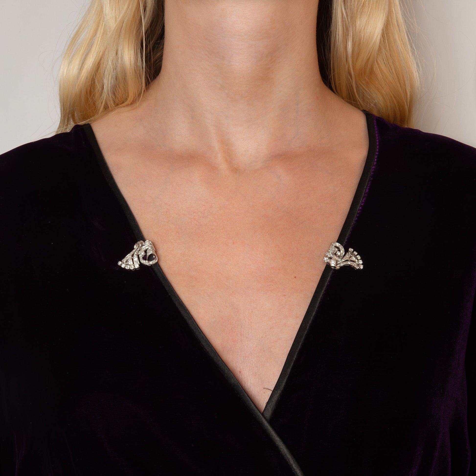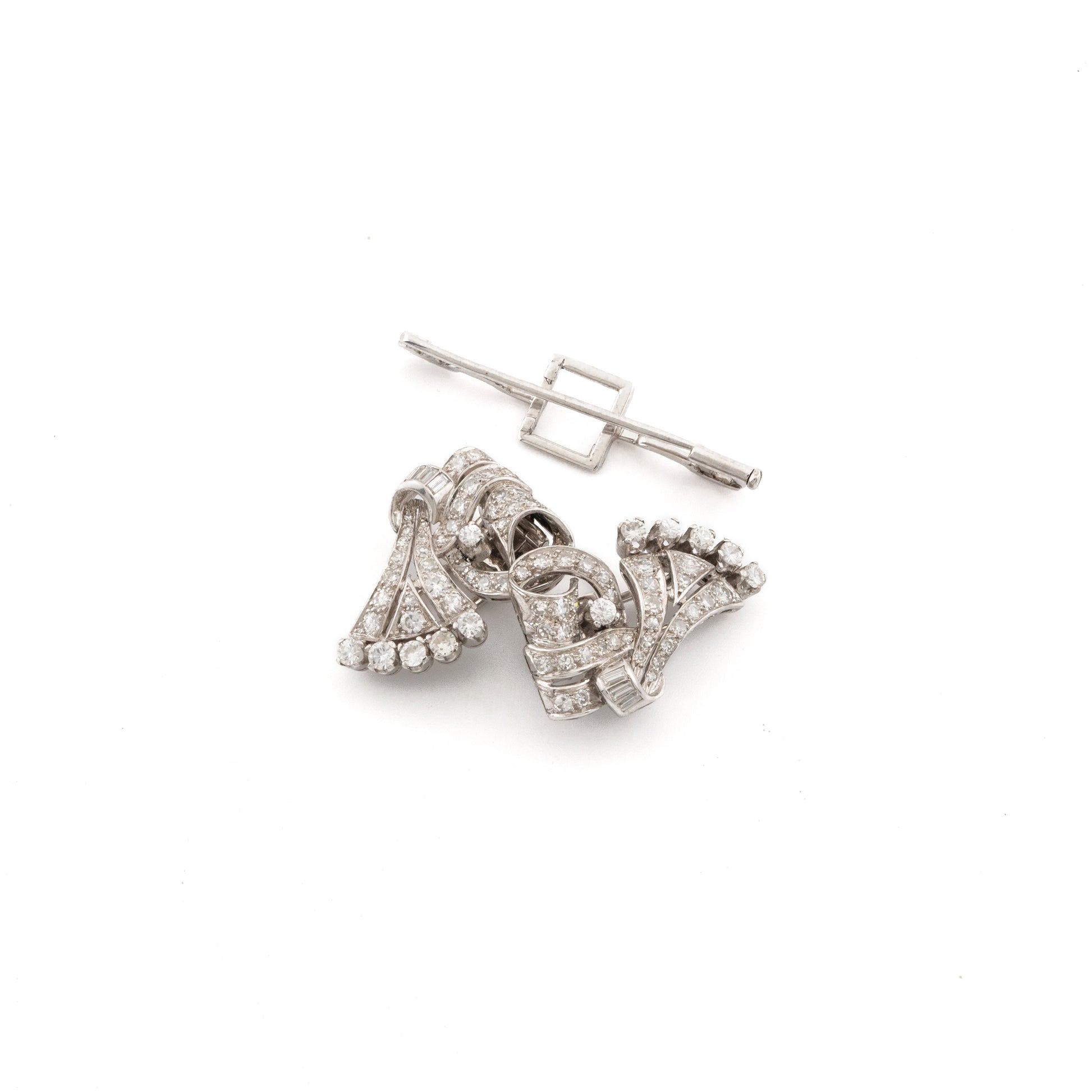 This Diamond Double Clip Brooch showcases a total of 2.65cts in transitional cut diamonds, combining Art Deco style with versatile elegance. Its immaculate design offers a sophisticated accessory suitable for various occasions, adding a refined touch to any outfit.