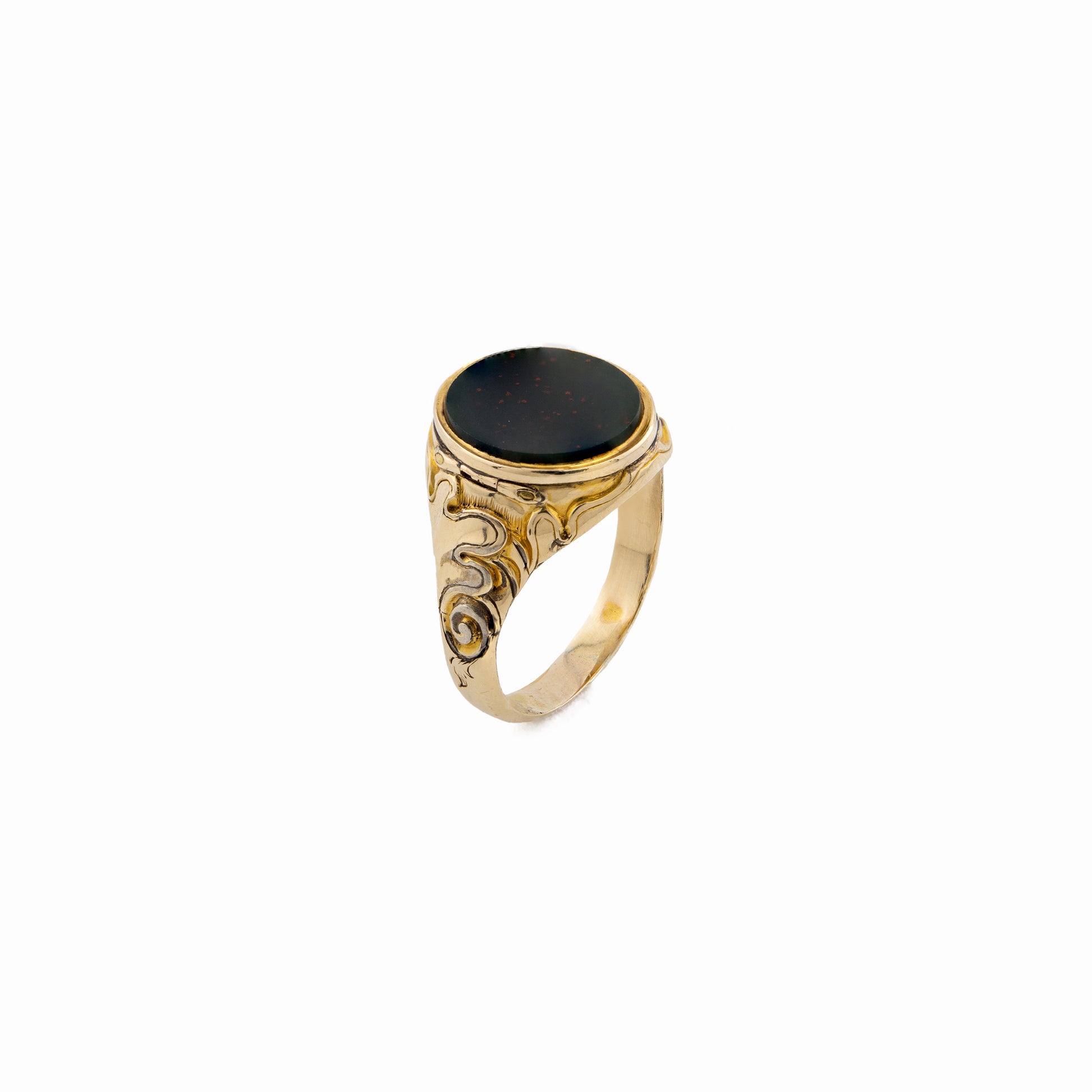 The richly coloured bloodstone displays deep green tones flecked with red inclusions, traditionally associated with protection and strength. The engraved scroll shoulders add Baroque-style flair, enhancing the ring’s presence and craftsmanship.