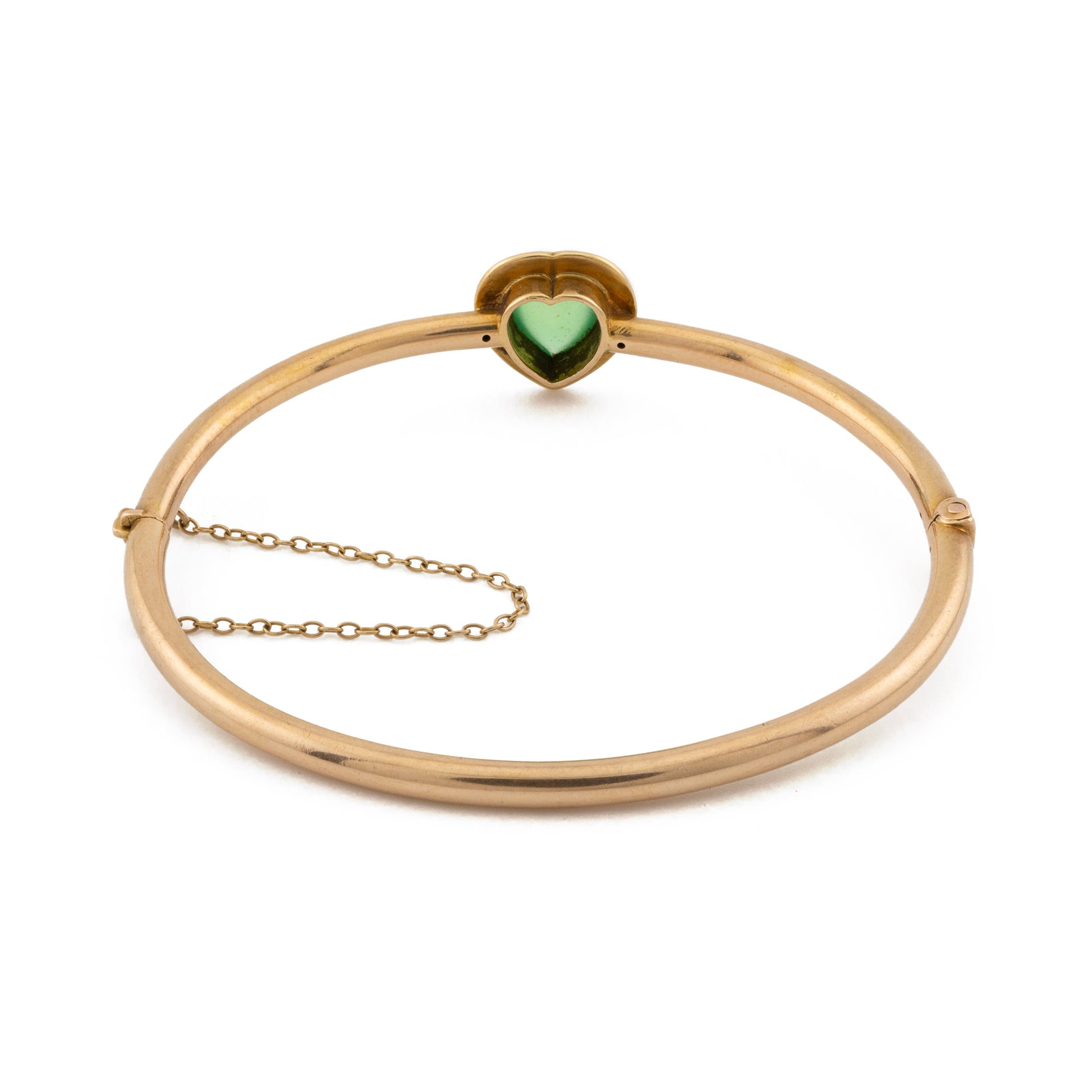 This 15ct heart-shaped bangle features chalcedony and pearl accents, designed with a semi-hollow structure for comfortable wear. It includes a hinged opening and a safety chain for secure fastening, combining elegance with practicality.