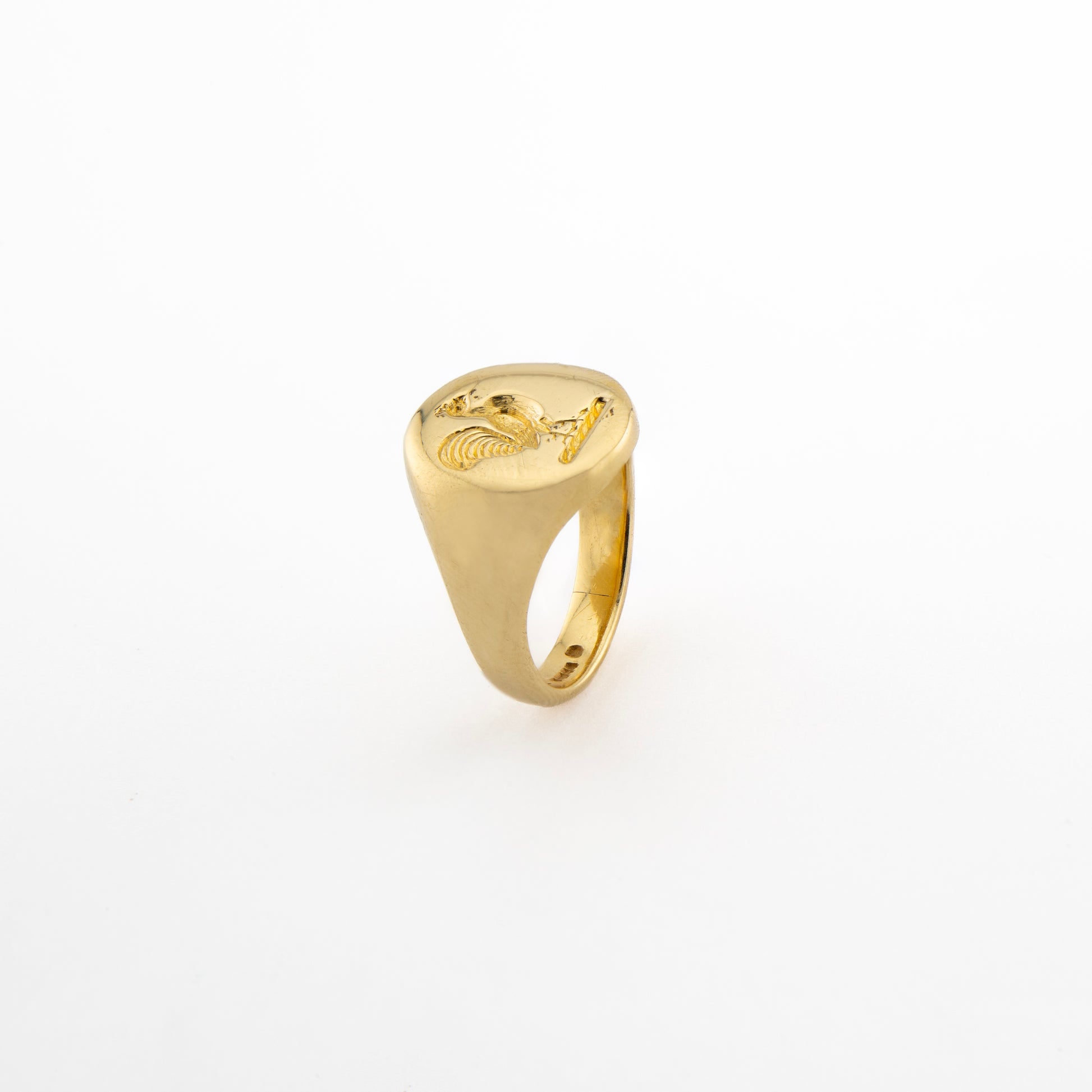 A handsome 18ct yellow gold signet ring featuring a finely engraved cockerel motif — a classic emblem of pride, vigilance, and confidence. Hallmarked in Birmingham in 1997, this solid piece bears full British assay marks and offers a satisfying weight and smooth, domed profile that sits beautifully on the hand.