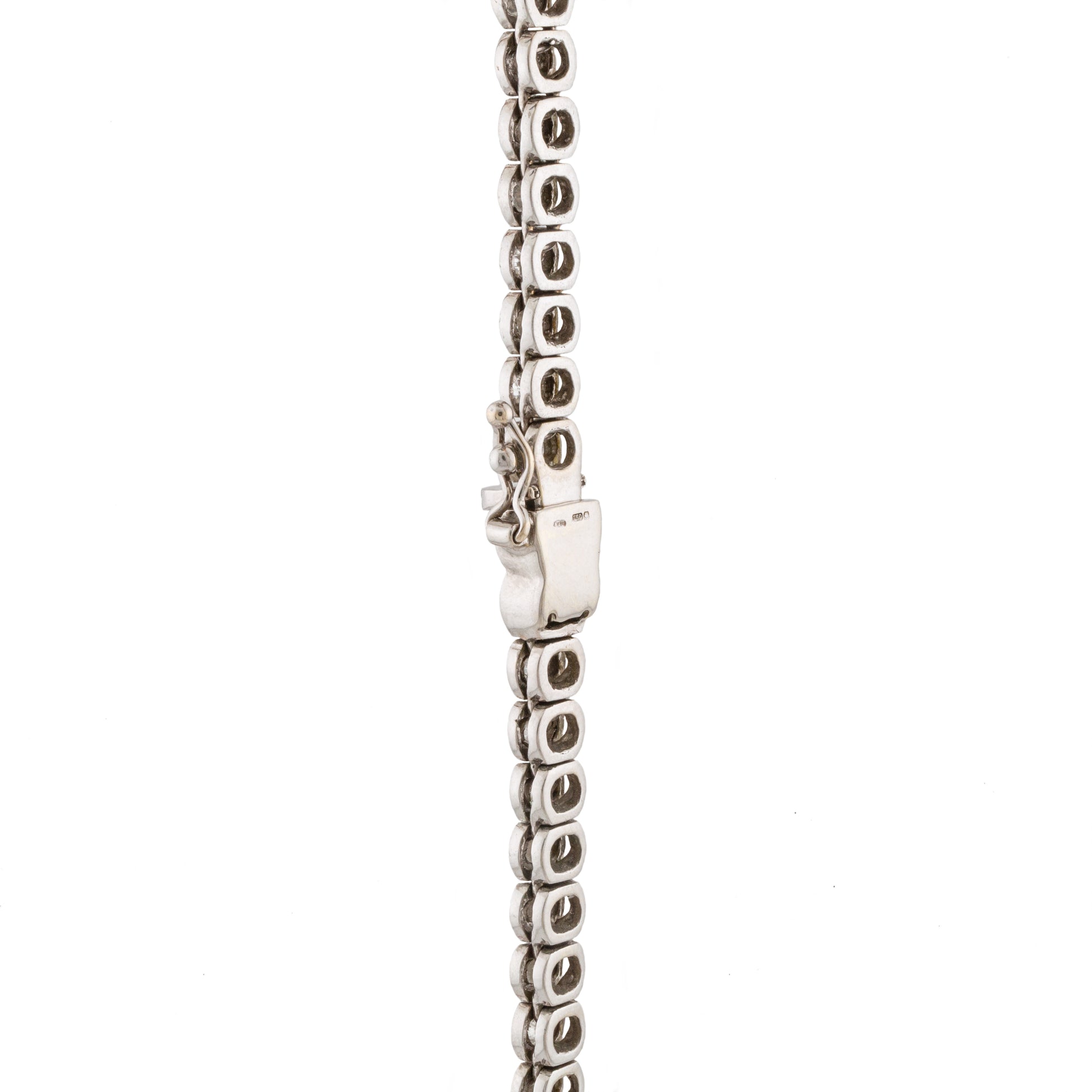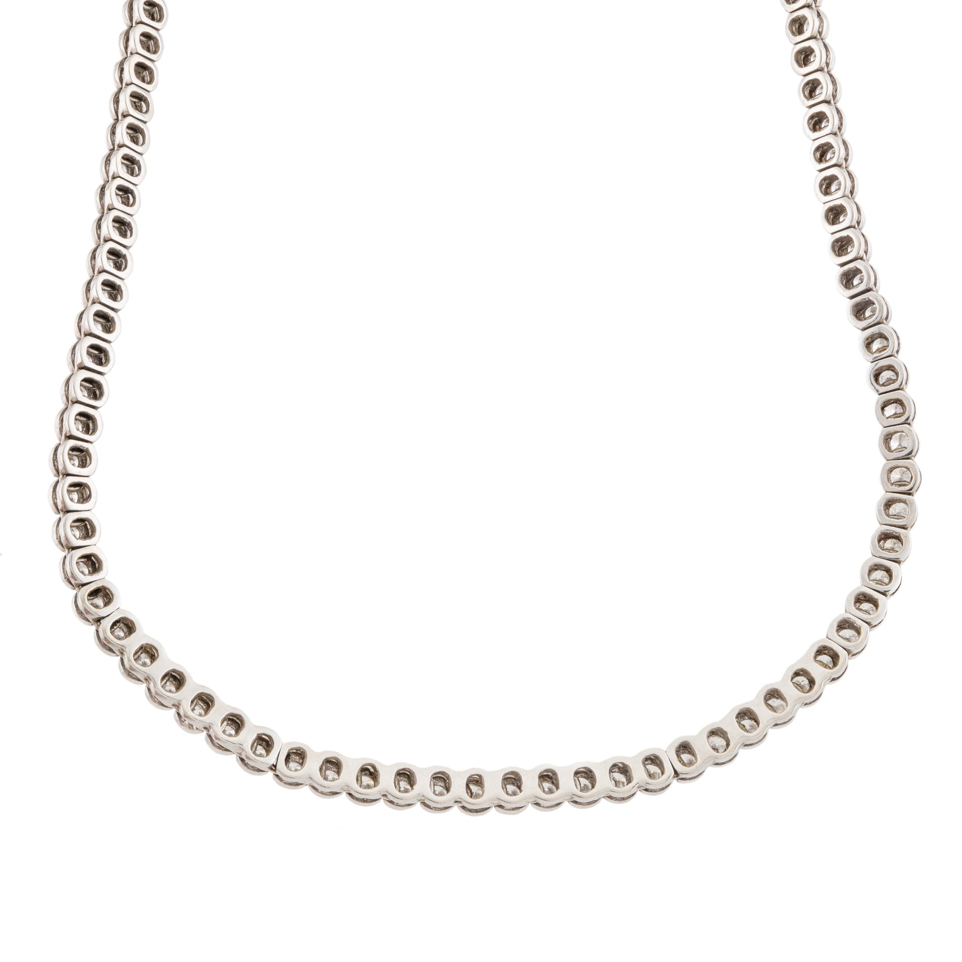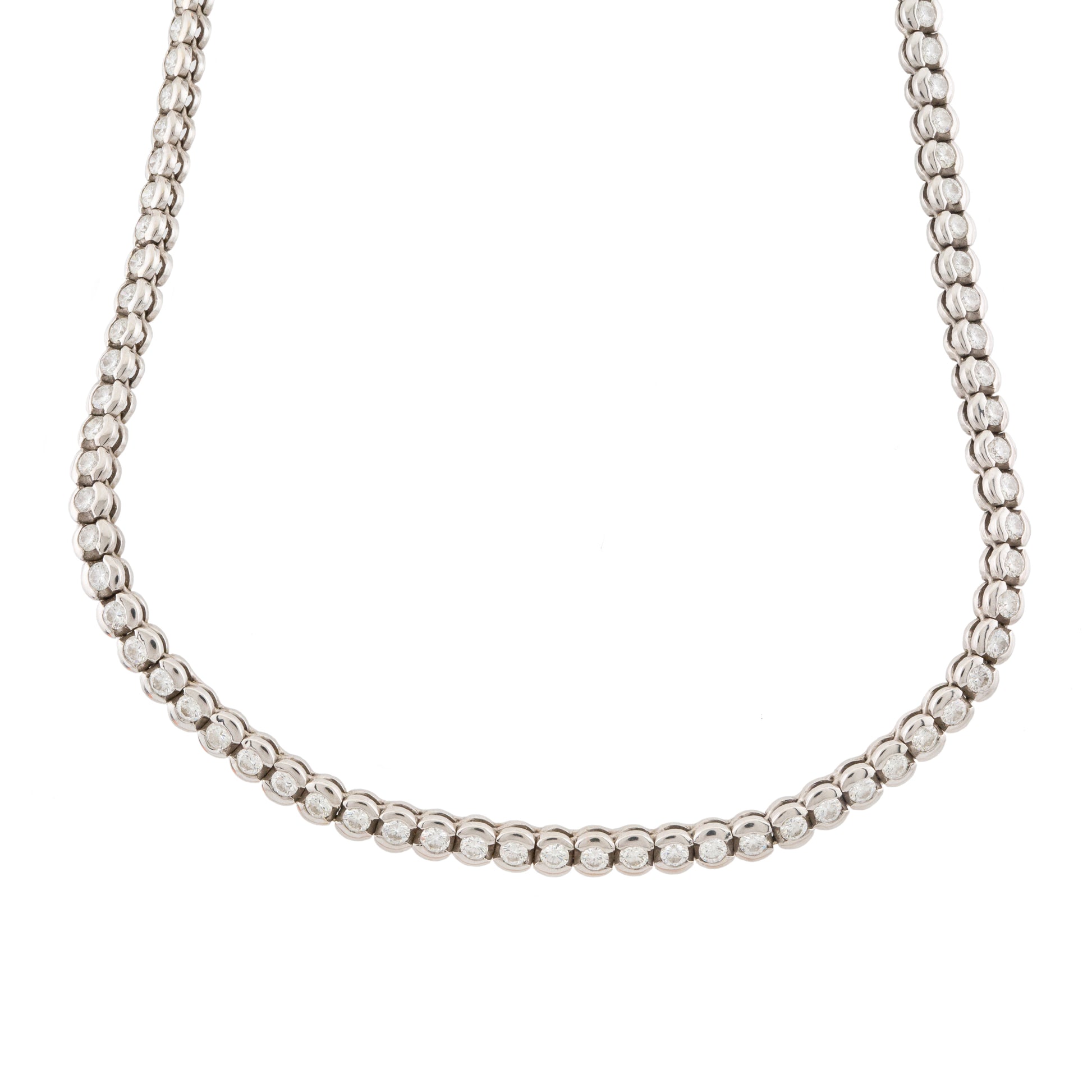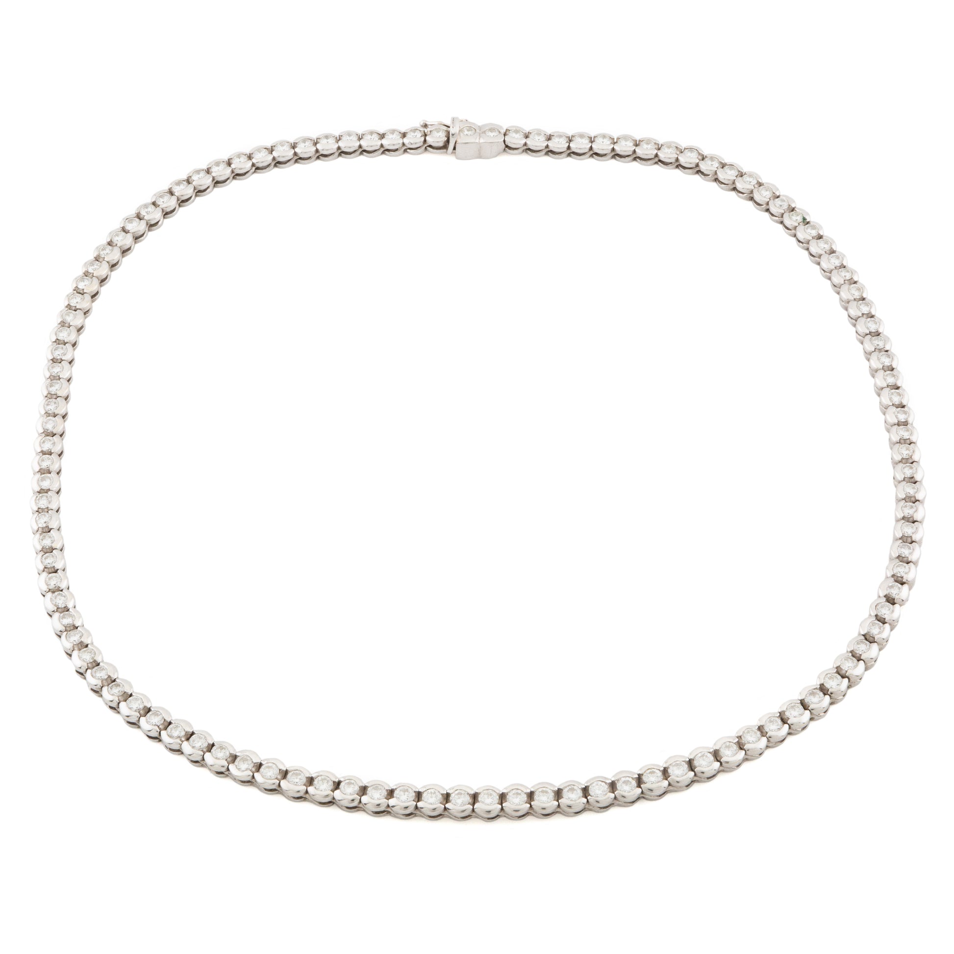 A stunning diamond tennis necklace in luxurious 18ct white gold, crafted in the UK by FEU makers. This elegant piece features approximately 6 carats of modern brilliant-cut diamonds, each meticulously claw-set in a continuous line that catches the light beautifully.