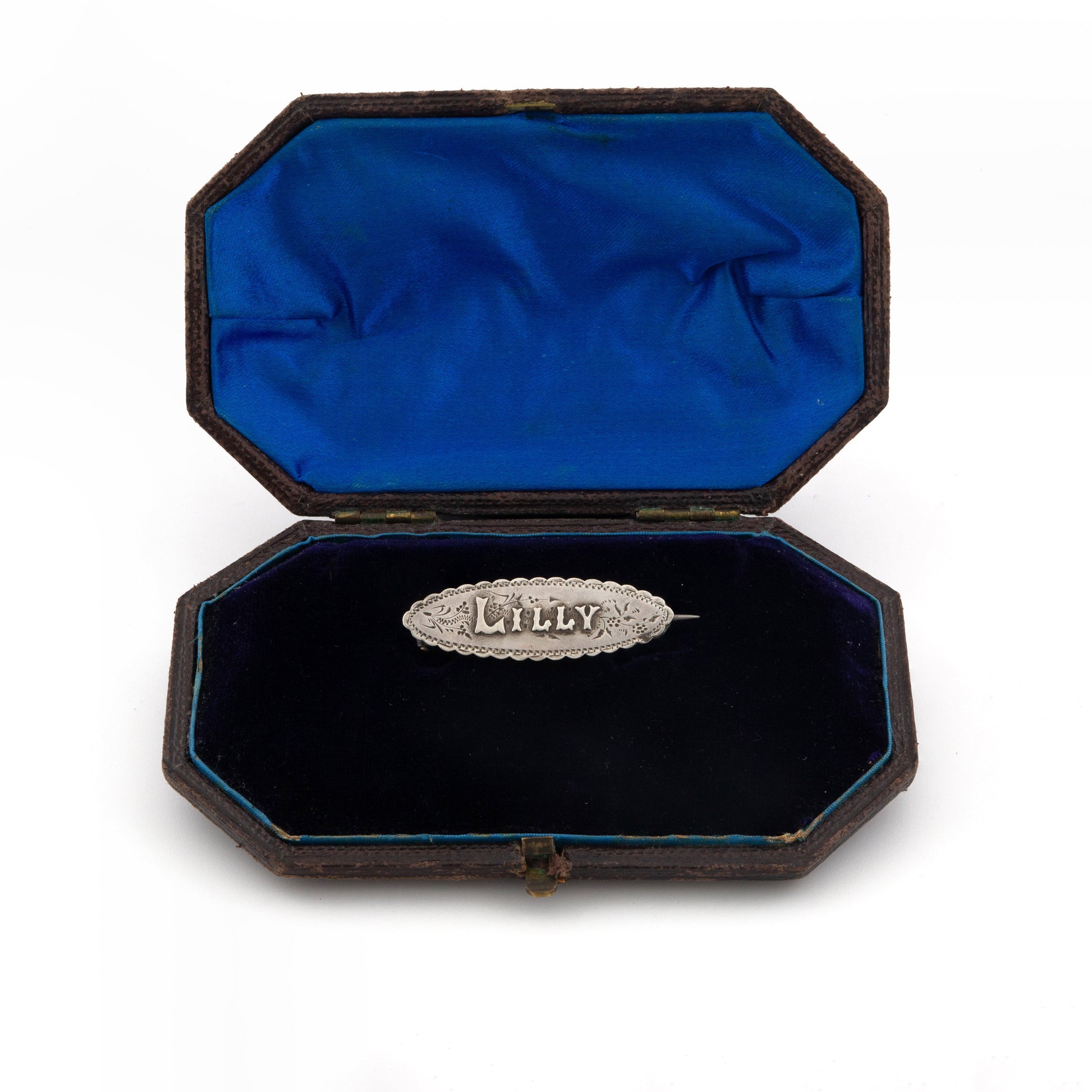 Each brooch features a name—sometimes a diminutive or affectionate nickname—delicately worked in silver, and often adorned with motifs such as hearts, flowers, ferns, horseshoes, or cornucopias for added meaning and good luck. The language of flowers was widely used, with symbols like forget-me-nots for remembrance, ivy for fidelity, and lilies for happiness.