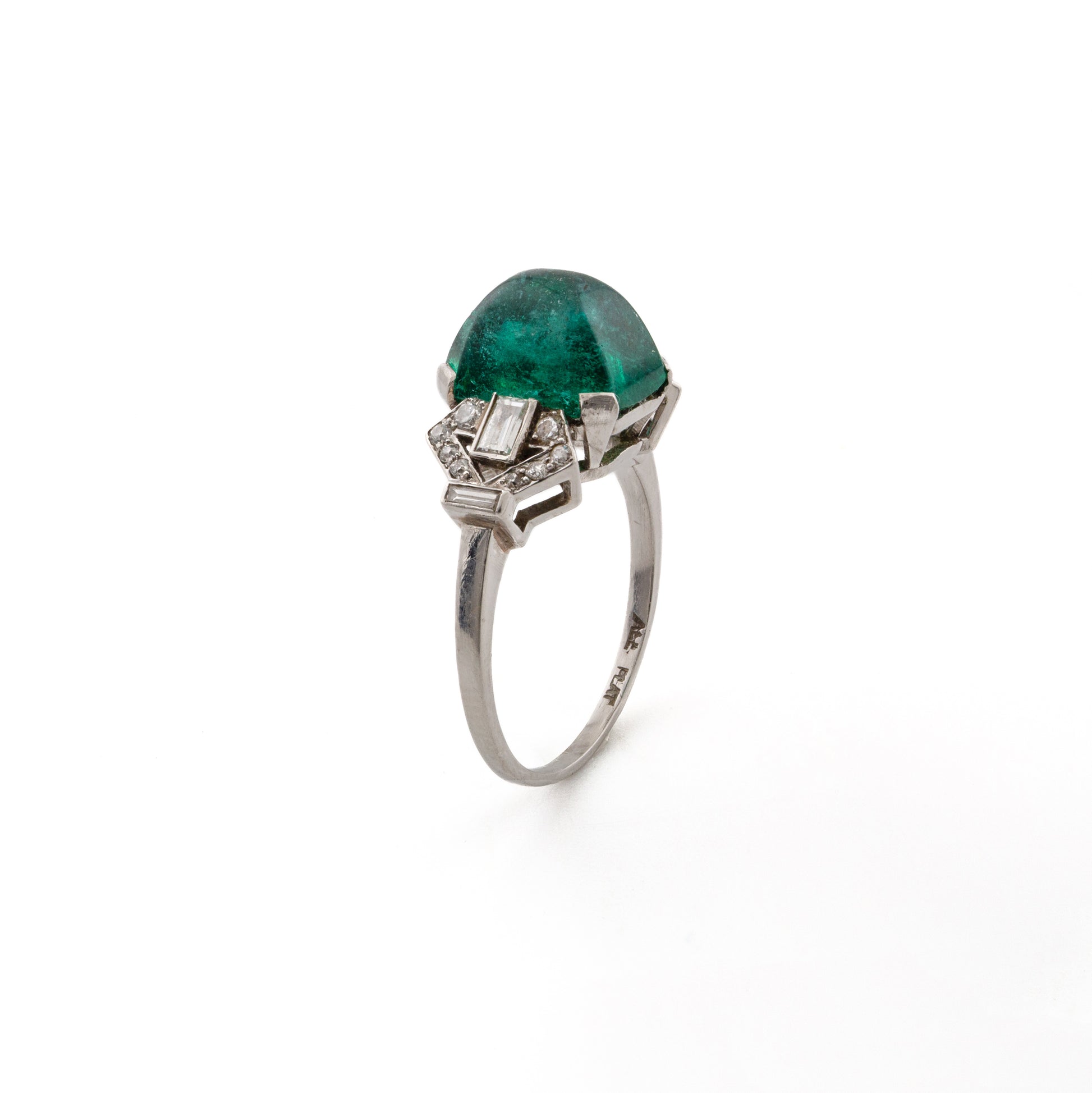 An exceptional Art Deco cocktail ring showcasing a vibrant Colombian sugarloaf-cut emerald weighing approximately 4.06 carats. The stone exhibits a rich, even green colour with natural internal inclusions characteristic of fine emeralds from this era.